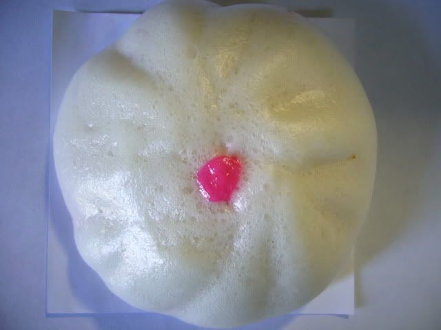 ซาลาเปาไส้สตอเบอรี่ แป้งขาวเนียนนำแป้งผสมสีชมพูทำเป็นจุกเพื่อเป็นเครื่องหมายไส้นี้