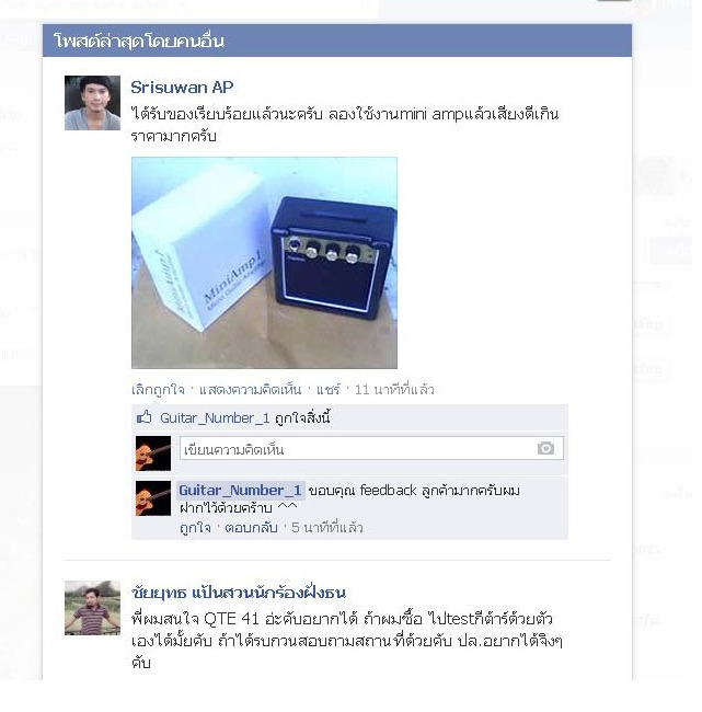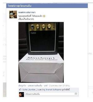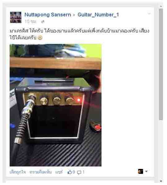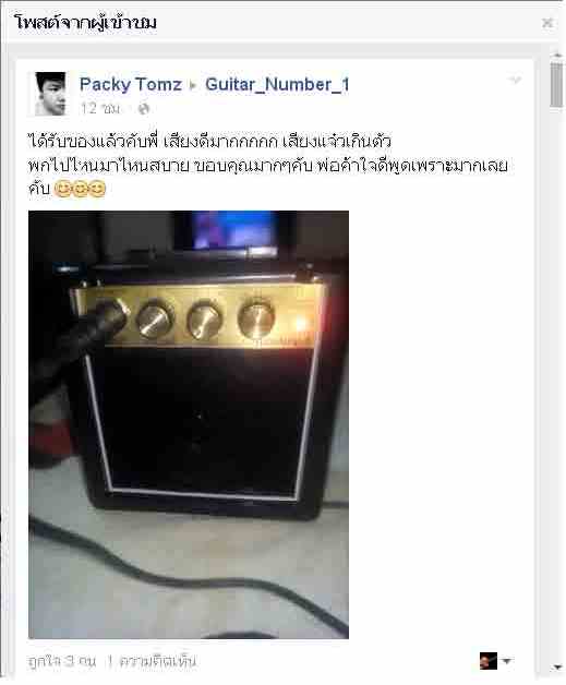 [HOT SALE] มินิแอมป์จิ๋วแต่แจ๋วใช้สำหรับซ้อมอยู่กับบ้านและเหมาะพกพาไปได้ทุกที่ ใช้ดีทั้งกีต้าร์ไฟฟ้าและกีต้าร์ acoustics มีโหมดเสียงคลีนและโหมดเอฟเฟคในตัว สามารถใช้ได้ทั้ง Battery 9V และ Adapter 9V ราคาปกติขายกันอยู่ที่ 1,500 บาท เราขายเพียง 750 บาทแถม Battery 9V ให้ด้วยจร้าา.... ** สินค้าได้รับ feedback ตอบรับเป็นอย่างดีจากผู้ใช้หลายราย ในเรื่องคุณภาพเสียงและความประหยัดถ่าน สินค้าดีมีคุณภาพราคามิตรภาพอย่างแท้จริง ** **Dimension:160x75xx110mmpower supply: 9V(6F22)battery(included)Specification:portable:with removable belt clipPower Output: 3WInput Jack: 1×InputOutput Jack: HeadphoneSpeaker: 3"x1Controls: Volume. Tone. Function (Overdrive /Power on / off)Power Supply: 9V(6F22) Battery (included) or MainsDimension: 130×70×130mmNet Weight: 330g - จัดส่ง EMS / Kerry Express ทั่วประเทศ พร้อมแพ๊คเกจอย่างดี!!! เชิญชมตัวอย่างเสียง >>> http://youtu.be/4xEquDcJu7g?list=UUY38d5ybxJf1Uo755obeGBQ* มีช่องเสียบ head phone ลำโพงและสายแจ๊คตามภาพ * * แพ๊ค Bubble 2 ชั้นกันกระแทกปลอดภัยจนถึงมือลูกค้า * * รับประกันชั้น 1 หากสิินค้าใช้ไม่ได้ เปลี่ยนคืนให้ทุกกรณี..!!! * Admin Tel 083-851-4906 Line : Guitar_number_1 Facebook : https://www.facebook.com/guitarnumberone/