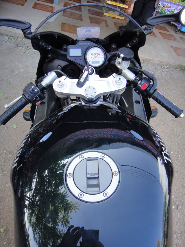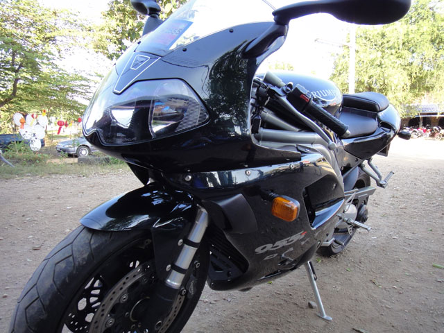 สเปกของ Triumph Daytona 955i Engine : 4-stroke, 3-cylinder 955 cc bore/stroke: Template:Convert/ 4 valve per cylinder DOHC, liquid cooled Compression ratio: 12.0:1 Power : 149 hp (111 kW) @ 10700 rpm Torque : 100 N·m (73.8 lb·ft) @ 8200 rpm Transmission : 6 gears Suspension : Front: 45 mm (1.8 in) forks with dual rate springs and adjustable preload, compression and rebound damping Brakes : Front: Double disc. 4-piston calipers. 320 mm (12.6 in) Tires Front: 120 / 70 ZR 17, Rear: 190 / 50 ZR 17 Wheelbase : 1,426 mm (56.1 in) Dimensions : L 2,112 mm (83.1 in) W 725 mm (28.5 in) H 1,165 mm (45.9 in) Seat height : 815 mm (32.1 in) Weight : 188.0 kg (414 lb) Fuel capacity : 21 l (4.6 imp gal; 5.5 US gal)