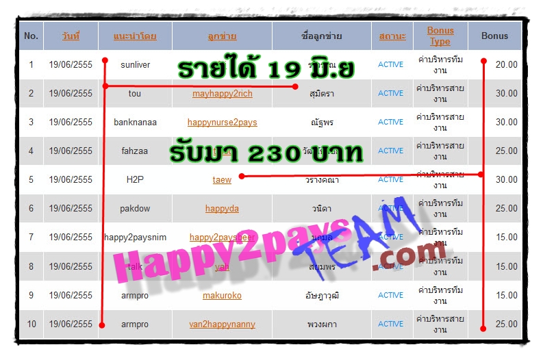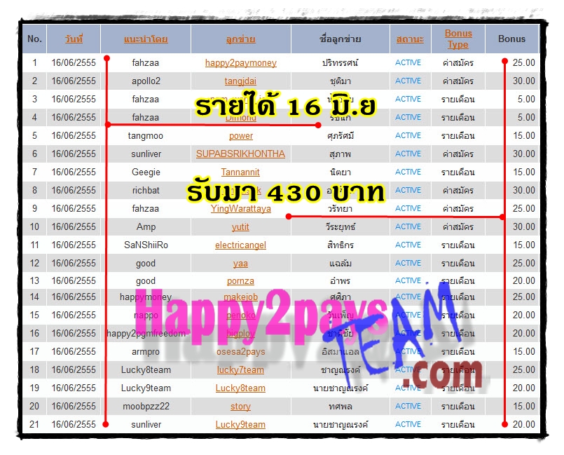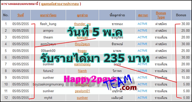 ไม่จำเป็นต้องอธิบายอะไรมากมาย ให้ดูรูปภาพทำความเข้าใจกันต่อเลยครับ ดูหลักฐานต่างๆ จากการทำงาน Happy2pays ดูวันที่อัพเดทด้วยน่ะครับ V รายได้ของเดือน พฤษภาคม 2555 จาก Happy2pays :MH46: V หลักฐานรายได้รวมทั้งหมด อัพเดท 10/11/2555 :MH21: V หลักฐานถอนเงินเข้าบัญชีธนาคารจริงๆ :MH50:  หน้าประวัติการใช้บริการเคาน์เตอร์เซอร์วิชครับ เข้าใจแผนการตลาดใหม่คร่าวๆด้วยวิดีโอด้านล่างนี้ครับ