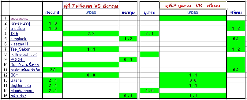 จบเกมส์. ฝรั่งเศส. อังกฤษ เสมอ๑-๑ ยูเครน ชนะ.สวีเดน. ๒- ๑ ฮูเรฮูเัึล  อ้าววววว ไม่ถูกสักคู่