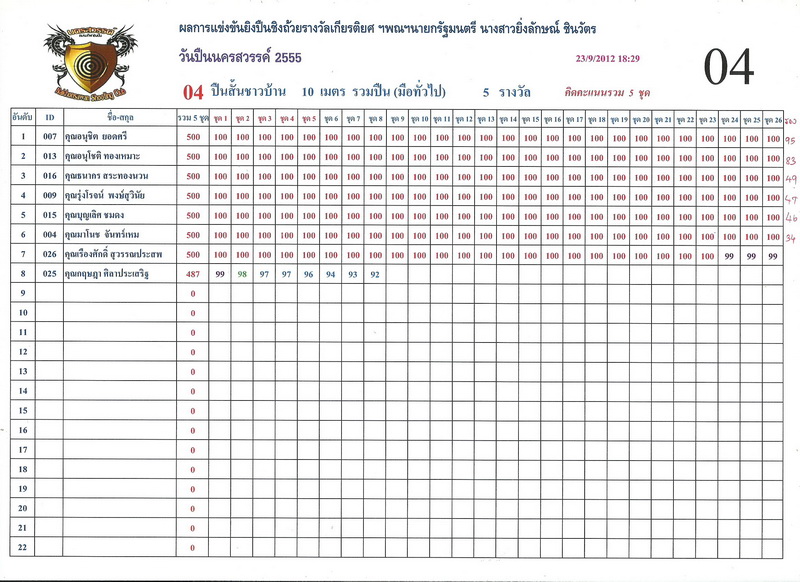 CR Shooting Team งานนี้จัดเต็ม ชุดใหญ่...นักกีฬา พร้อม โค๊ช พร้อม ตอนนี้ ชุดยิง นักกีฬา จองเต็มแล้ว ที่เหลือ ก็ไปเก็บตก หน้าสนามแข่ง นะครับ ผมจะโอนเงินไปพะเยา วันจันทร์ที่ 29/10/55 วันที่ 11/11/55 นัดหมายกันอีกที กี่โมงล้อหมุนเคลื่อนทัพ .ครับ...เอาสถิติ 10 เมตร แข่งถ้วย นายก ล่าสุด ที่นครสวรรค์ มาให้ชม ครับ คนได้ที่ 1 น่าจะซื้อเป้า 150 เป้า เลือกส่ง 121 เป้า (คะแนนเต็ม 100)ยิงเป้า 10 นัด ลองคิดเล่นๆ เป้า 150x100= 15,000 กระสุน 800x30=24,000 รวม 39,000 บาท ยิงแต้ยิงว่า.....  แข่งทีซื้อปืนได้เป็นกระบอก กำลังฃ้อมเวลายังไม่คอยได้(2.25วิของเก๋)นายสนามกำลังช่วยปรับเป้าและแนวยิง  ศุกร์นี้ผมเข้าไปลองบ้าง  เอิ้นตวยเด้อ..จะเอาปืนขี้เมี้ยงไปลองซักกำ..  ได้กะเสี่ย