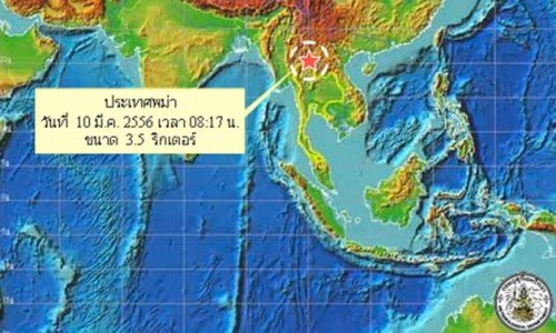 สำนักเฝ้าระวังแผ่นดินไหว กรมอุตุนิยมวิทยาของไทยรายงานว่า เมื่อวันที่ 10 มี.ค.2556 เวลา 08.17 น. เกิดเหตุแผ่นดินไหวที่ประเทศพม่า อยู่ทางตอนเหนือของอ.แม่จัน จ.เชียงราย วัดแรงสั่นสะเทือนได้3.5ริกเตอร์ http://www.matichon.co.th/news_detail.php?newsid=1362889909 news_img_494187_1.jpg (50.5 KB, 500x300 - ดู 275 ครั้ง.) autis125
