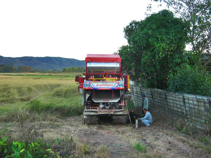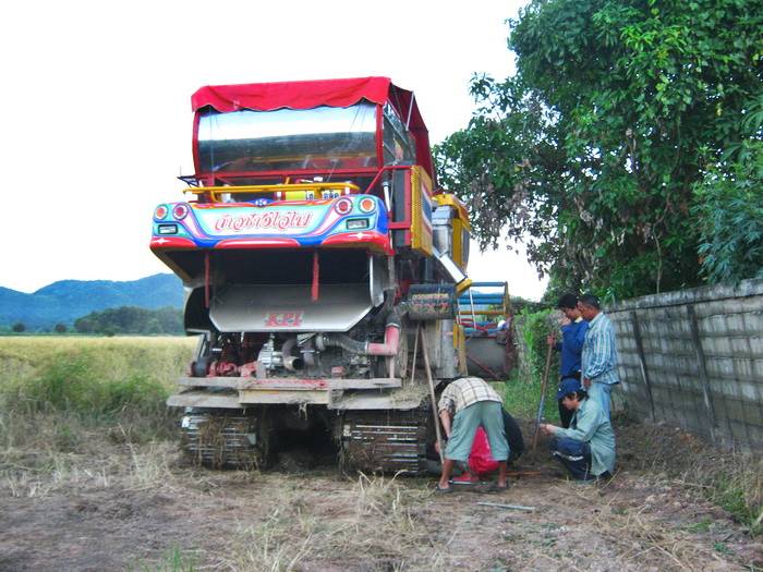 รถเกี่ยวข้าวเป็นรถที่มีเทคโนโลยีที่ค่อนข้างน่าสนใจ ส่วนใหญ่จะเห็นเป็น Made in Thailand พิษณุโลกนี่เอง การนำเครื่องและช่วงล่างมือสองจากญี่ปุ่นมาดัดแปลงประกอบ รถเกี่ยวมีทั้งระบบขับเครื่อง ระบบเกี่ยว ระบบนวดข้าว และระบบลำเลียง ส่วนใหญ่ใช้ระบบไฮโดรลิกและสายพานเป็นสำคัญ ใช้เครื่องยนต์ขนาดใหญ่น่าจะสิบล้อ ช่วงนี้มีโอกาสได้ศึกษาการทำงาน การซ่อมบำรุงค่อนข้างบ่อย เผื่อได้มีโอกาสเป็นเจ้าของรถเกี่ยวบ้าง วันก่อนไปช่วยเปลี่ยนสายพานรถเกี่ยวข้าวอย่างเกษตรพัฒนาด้านซ้าย...แม่เจ้านับสายพานได้ตั้ง 18 เส้น เครื่องยนต์อีก 2 เส้นด้านขวาอีกนับ 10 เส้น การเปลี่ยนเมื่อสายพานยานหรือขาด แต่วันนี้ช่วงเย็นไปช่วยดูระบบช่วงล่างครับคือช่วงล่างรถแบคโฮ ดีดีนี่เอง ล้อตีนตะขาบมีอาการเสียงดังเวลาถอย ลองอัดน๊อตล้ออาการไม่หายโทรถามศูนย์สุดท้ายต้องลองเปลี่ยนน้ำมันเกียร์ดูก่อนครับ..