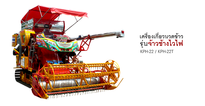รุ่น จ้าวช้างไวไฟ KPH-22T ขนาด (กว้างxยาวxสูง) ขณะพับถังเก็บ มม. 3,400 x 6,600 x 2,980 ความกว้างเฟรมโรลเลอร์ มม. 1,600 ใบแทรค (กว้างxยาวxหนา) มม. 127 x 750 x 45 ใบแทร็คโรงงาน 127 x 750 x 20 ใบแทร็คแบ็คโฮ ความจุถังเก็บข้าว กก. 2,500 ความสูงท่อส่งข้าวเมื่อกางออก มม. 4,600 น้ำหนัก (น้ำมันเต็มถัง) กก. 9,000 ความจุถังน้ำมันเชื้อเพลิง ลิตร 120 เกจ์วัดระดับและอุณหภูมิข้างถังน้ำมัน ไฮดรอลิก แสดงระดับน้ำมันไฮดรอลิก และแสดงอุณหภูมิในหน่วยองศาเซลเซียส และองศาฟาเรนไฮต์ เครื่องยนต์ MITSUBISHI, HINO กำลังเครื่องยนต์ แรงม้า 210-225 ระบบเกี่ยวตัด ระบบตัดแบบใบมีดปัตตาเลียน ใบมีดแข็งพิเศษ ความยาวของราวใบมีด มม. 3,050 (40 ใบ) ระบบควบคุมหัวเกี่ยว ระบบไฮดรอลิกยกหัวเกี่ยวอิสระ ระบบนวด ลูกนวด SPIKE TOOTH แบบไหลตามแนวแกน ความยาวลูกนวด มม. 1,740 (6 ฟุต) เส้นผ่านศูนย์กลางลูกนวด มม. 559 (22 นิ้ว) ระบบทำความสะอาด พัดลมและตะแกรงโยก ระบบขับเคลื่อน แบบตีนตะขาบโซ่แทร็คและโรลเลอร์ ความยาวโซ่แทร็ค ข้อ/เส้น 48 โรลเลอร์ ลูก/ข้าง 12 ลูก (บน 2 ลูก, ล่าง 10ลูก) ระบบถ่ายทอดกำลัง ปั๊มไฮดรอลิก ปั๊มคู่ (TANDEM PUMP) ระบบควบคุมการขับเคลื่อน ควบคุมความเร็วซ้าย-ขวา แยกอิสระจากกัน ทั้งเดินหน้าและถอยหลัง ระบบช่วงล่าง 12 HT ความเร็วสูงสุด กม./ชม. 11 ความเร็วที่เหมาะสม กม./ชม. 3-5 สมรรถนะการทำงาน ไร่/ชม. 4-8 (ขึ้นอยู่กับสภาพแปลงนา และสภาพข้าว) การสิ้นเปลืองเชื้อเพลิง ลิตร/ไร่ 2-4 (ขึ้นอยู่กับสภาพแปลงนา และสภาพข้าว) อัตราการสูญเสีย น้อยกว่า 5% (ขึ้นอยู่กับสภาพแปลงนา และสภาพข้าว) จำนวนผู้ปฏิบัติงาน 1 ผู้ผลิต KASET PHATTANA INDUSTRY CO.,LTD.