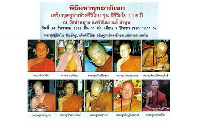 ;)ประวัติการสร้างพุทธาภิเษกขึ้น เมื่อ 24 ธันวาคม 2536 โดยพระสุปฎิปันโนศิษย์สายครูบาเจ้าศรีวิไชย อธิษฐานจิตลงอักขระ แผ่นทอง นาค เงิน เช่น ครูบาสิงหวิชัย วัดฟ้าฮ่าม จ.เชียงใหม่ ....ครูบาอินทร์ วัดฟ้าหลั่ง จ.เชียงใหม่ ....ครูบาดวงดี วัดท่าจำปี จ.เชียงใหม่ ....ครูบาคำปัน วัดหม้อคำตวง จ.เชียงใหม่ ....ครูบาชัยวงศ์ วัดพระบาทห้วยต้ม จ.ลำพูน ....พระครูสังวรญาณ สำนักปฎิบัติธรรมสังวราราม จ.ลำพูน ....พระครูขันตยาภรณ์(จันทร์) วัดเจดีย์หลวง จ.เชียงใหม่ ....พระครูบวรสุขบท(ครูบาสุข) วัดป่าซางน้อย จ.ลำพูน ....ครูบาผัด วัดศรีดอนมูล จ.เชียงใหม่ ...ครูบาประเทือง วัดบ้านเด่น จ.เชียงใหม่ ...แผ่นทอง นาค เงิน ลงอักขระอธิฐานจิตจาก 9 วัดมีนามเป็นมงคล ...วัดศรีเกิด- วัดดวงดี – วัดชัยมงคล วัดชัยพระเกียรติ – วัดหม้อคำตวง –วัดหมื่นเงินกอง วัดหมื่นล้าน –วัดเชียงยืน – วัดเชียงมั่น ...พระคณาจารย์ 15 รูป เจริญพระพุทธมนต์ พิธีพุทธาภิเษก โดยมีพระเถระศิษย์ครูบาเจ้าศรีวิไชย อธิฐานจิต ได้แก่...ครูบาอิน วัดฟ้าหลั่ง จ.เชียงใหม่ ....ครูบาชัยวงศ์ วัดพระบาทห้วยต้ม จ.ลำพูน ....พระครูสังวรญาณ สำนักปฎิบัติธรรมสังวราราม จ.ลำพูน ....พระราชธีราภรณ์ เจ้าคณะจังหวัดลำพูน วัดพระธาตุหริภุญชัย จ.ลำพูน ....พระสุเทพสิทธาจารย์ วัดพระธาตุดอยสุเทพ จ.เชียงใหม่ ....พระครูบวรสุขบท(ครูบาสุข) วัดป่าซางน้อย จ.ลำพูน ....ครูบาคำปัน วัดหม้อคำตวง จ.เชียงใหม่ ...ครูบาสิงหวิชัย วัดฟ้าฮ่าม จ.เชียงใหม่ ....ครูบาผัด วัดศรีดอนมูล จ.เชียงใหม่ ....ครูบาประเทือง วัดบ้านเด่น จ.เชียงใหม่....จำนวนการ