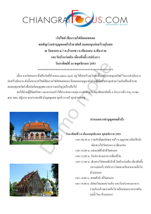 เวปไซค์เชียงรายโฟกัสดอทคอม ขอชิญร่วมทำบุญทอดผ้าป่าสามัคคี สมทบทุนก่อสร้างอุโบสถ วันอาทิตย์ที่ 14 พฤศจิกายน 2553 ณ วัดสบกก ม.7 ต.บ้านแซว อ.เชียงแสน จ.เชียงราย และวัดบ้านร่มเย็น เมืองต้นผึ้ง สปป.ลาวเนื่องจากวัดสบกก ซึ่งเป็นวัดที่บ้านของ admin Ap41 อยู่ ได้ก่อสร้างอุโบสถขึ้นแต่ยังขาดทุนทรัพย์ ในการดำเนินการก่อสร้างอีกมาก ดังนั้นทางเวปไซค์เชียงรายโฟกัสดอทคอม จึงขอบอกบุญมายังท่านผู็มีจิศรัทธาทุกท่านร่วมกันเป็นเจ้าภาพสมทบทุนทรัพย์ เพื่อบังเกิดบุญกุศล และความเจริญรุ่งเรืองสืบไปขอเรียนชี้แจงกับสมาชิกครับ ทำไมต้องให้ทางผมเป็นผู้ดำเนินการ สมาชิกหลายท่านอาจสงสัย?1.งานนี้ได้รับความเห็นชอบจาก ท่านเวปมาสเตอร์แล้ว อยากให้เป็นกิจกรรมประจำปีของเวปครับ 2.เป็นสมาชิกเวปเชียงรายโฟกัสฯ ที่มีเวลาว่างพอที่จะทำโครงการนี้ และรู้จักกับท่านเวปและAdmin Ap41เป็นการส่วนตัว 3.ท่านเวป ช่วงนี้งานเข้าเยอะมาก( เลี้ยงตัวเล็กและดูแลเวปอีก) 4.อยากให้สมาชิกได้มีส่วนร่วมด้วยกันในการทำบุญในนามเวปฯ รายละเอียดอื่นจะแจ้งให้ทราบเรื้อยๆครับป.ล. admin ที่ขอชื่อไปรบกวนช่วย pm แจ้งผมด้วยครับหมายเลขบัญชี สำหรับโอนเงินร่วมบริจาคทำบุญครั้งนี้ ธ.กสิกรไทย สาขาเชียงราย ชื่อบัญชี เชียงรายโฟกัส หมายเลขบัญชี 154-2-04605-6