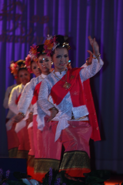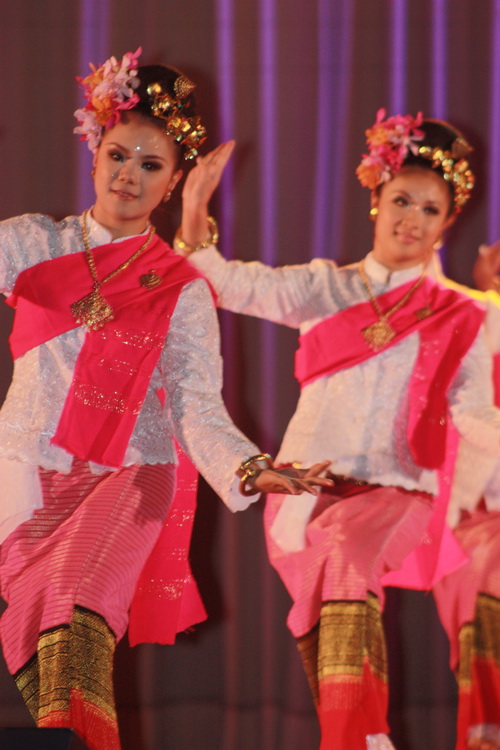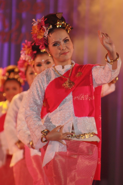 จ่างฟ้อน แขนอ่อน นุ่งซิ่นไหมหม่อน ห่มสไบสวย เกล้าผมมวย ทัดดอกไม้คำ เล็บยาวงาม ยามน้องใส่ร่ายรำ ก้าวไปตาม เสียงกลองตึ่งนง