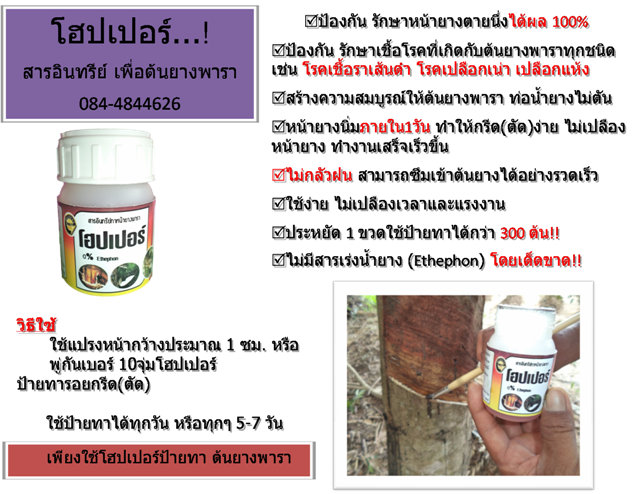 โฮปเปอร์ สารอินทรีย์เฉเพาะยางพารา http://youtu.be/rXmb6p0_PiMประหยัด 1 ขวดใช้ป้ายทาได้กว่า 300 ต้น!! ไม่มีสารเร่งน้ำยาง (Ethephon) โดยเด็ดขาด!! ขวดละ 500 บาท ส่งฟรีEMS ยกแพค 10 ขวด 3,700 บาท ส่งฟรีEMS 10 ท่านแรก สั่งยกแพค 10 ขวด 3,700 บาท แถมฟรี 2 ขวด ส่งฟรี EMS 084-4844626