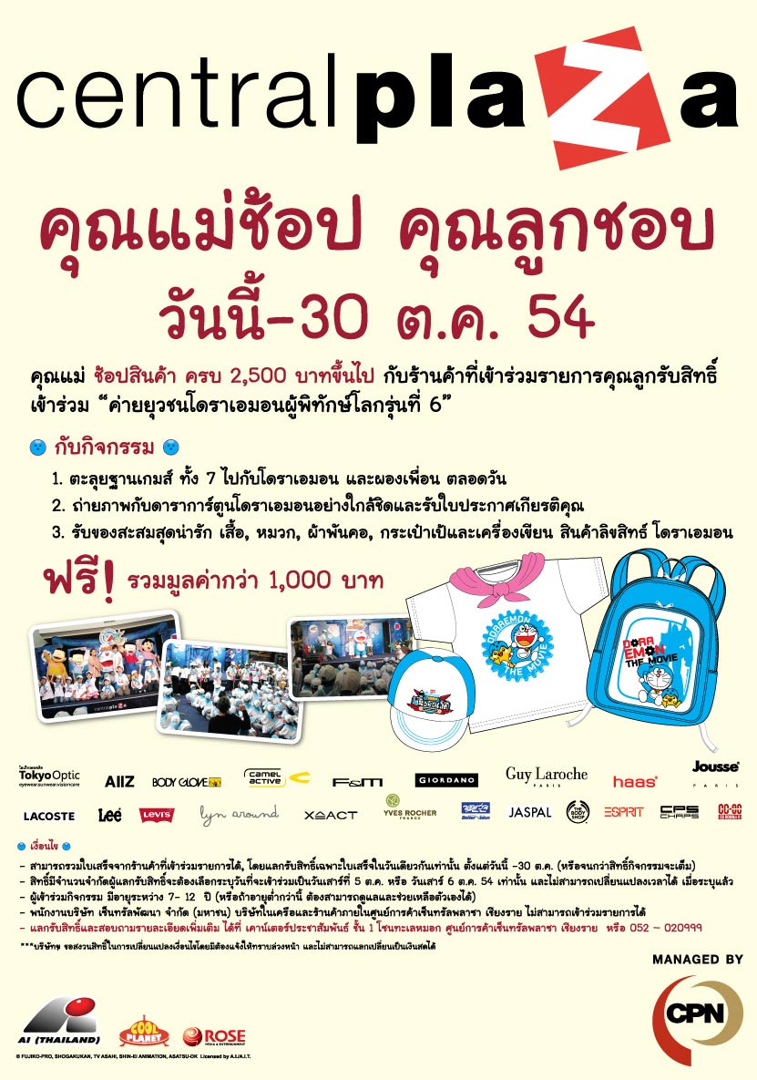 ศูนย์การค้าเซ็นทรัลพลาซา เชียงราย จัดงาน “โดราเอมอน” เอาใจเด็กๆ กับตัวการ์ตูนยอดนิยมที่โด่งดังทั่วโลก พร้อมพองเพื่อนทั้ง 5 ตัว มาร่วมให้น้องๆ หนูๆ ได้ถ่ายรูปอย่างใกล้ชิดและสนุกกับกิจกรรม Doraemon Walk in Meet & Greet ในแต่ละฐาน พร้อมพบกับกิจกรรมการแสดงมายากล และการเล่นเกมส์แจกของรางวัลมากมาย แล้วมาพบกับโดราเอมอน พร้อมพองเพื่อนได้ในระหว่างวันที่ 3-6 พฤศจิกายน 2554 ณ โซนทะเลหมอก ศูนย์การค้าเซ็นทรัลพลาซา เชียงราย