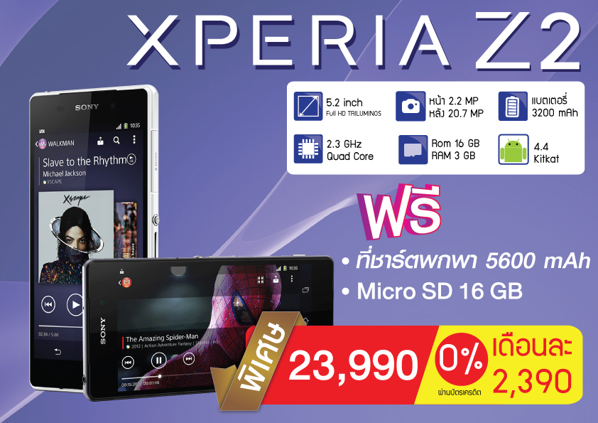 XPERIA Z2 ราคา 23990 ซิ้อวันนี้รับฟรี POWERBANK+MICRO16GB ด่วนของเเถมมีจำกัด หมดเเล้วหมดเลย