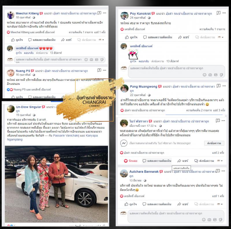 รถเช่าเชียงราย ราคาถูก 666 บาท/ วัน พร้อมส่ง/คืนรถ ที่สนามบินเชียงราย สะดวก บริการด้วยความเป็นมิตร ตรวจสอบรถทุกคันก่อนให้บริการ มั่นใจในเรื่องความปลอดภัย สะอาด ไม่ต้องใช้บัตรเครดิต เช่ารถเชียงราย ราคาประหยัด บริการมืออาชีพ เลือกอุ้ยคำ ทำไมต้องเช่ารถเชียงรายกับอุ้ยคำ ✚ ค้ำประกันเริ่มต้นเพียง 1,000 บาท ✚ การันตีเรื่องคุณภาพและราคา ✚ บริการตรงต่อเวลา ✚ รับ/คืน รถที่สนามบินเชียงราย ✚ การันตีเรื่องความสะอาด ✚ หมดปัญหาเรื่องกลิ่นในรถ ✚ ประกันภัยรถชั้น 1 ✚ ไม่ต้องใช้บัตรเครดิต ✚ มั่นใจเรื่องความปลอดภัย ตรวจเช็ครถก่อนบริการลูกค้า ✚ ทำงานอย่างเป็นมืออาชีพ ✚ พร้อมมีบริการนำเที่ยวเชียงราย ---------------------------------- อุ้ยคำ รถเช่าเชียงราย . https://goo.gl/maps/ncvYQX7SVbMFuB9A8สอบถามข้อมูล หรือจองรถได้หลายช่องทาง Tel : 0871888150 Line: chayen001 Add Line อัตโนมัติ คลิกเลย . https://line.me/ti/p/L_q3U_o0nOหรือคลิก https://www.facebook.com/carcr789/
