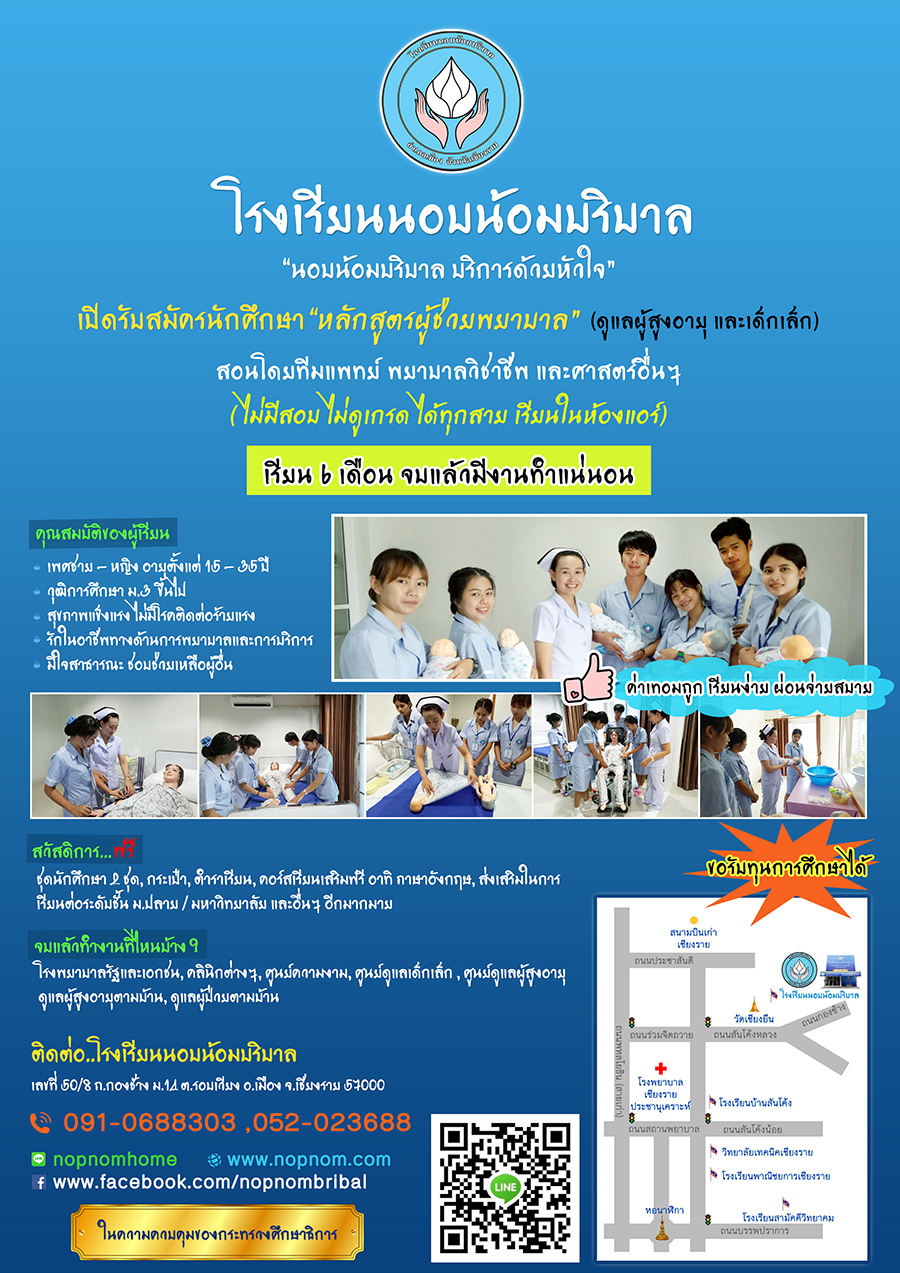 โรงเรียนนอบน้อมบริบาล เชียงราย รับสมัครนักศึกษาเรียนหลักสูตรผู้ช่วยพยาบาล (เรียน 6 เดือน จบแล้วมีงานทำ มีทุนเรียนฟรี) ID Line : nopnomhome Tel. 091-0688303 รู้จักโรงเรียนให้มากขึ้น > www.nopnom.com