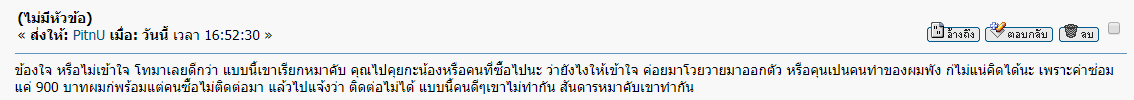 http://www.chiangraifocus.com/forums/index.php?topic=970795.msg10217397โน๊ตบุคเครื่องนี้ คีย์บอร์ดมีปัญหาไม่แจ้งในกระทู้ น้องผมซื้อมาพอเจอปัญหาก็แจ้งท่านไว้แล้ว พอทดสอบจริง ๆ เสียไปเกือบ 10 ปุ่ม น้องผมเอามาให้ผมดู ผมจึงบอกให้แจ้งเจ้าของเครื่องเลย พอโทรไปแจ้งมาโทษว่าผมเปลี่ยนอะไหล่หรือเปล่า ทั้ง ๆ ตอนผมดูนั้นน้องเขาก็อยู่ด้วยตลอดอีกอย่างผมไม่ใช่ร้านซ่อม ผมจะเอาอะไหล่ไหนมาเปลี่ยน สุดท้ายบอกให้เอาเครื่องไปไว้ร้านเพื่อนของเขาเพื่อตรวจสอบ น้องผมเข้าไปที่ร้าน เพื่อนเขาไม่ยอมมาดูด้วยซ้ำบอกแค่ให้เอาทิ้งไว้ น้องผมไม่อยากทิ้งไว้กลัวจะเสียเยอะไปกว่านี้ สุดท้ายด้วยความเด็กไม่อยากวุ่นวายเลยตัดใจทำอะไรละยอมเสียบใช้คีย์บอร์ดนอกแทน ผมก็ไม่ได้ติดใจอะไรนะ เพียงแค่เสียความรู้สึกเพราะเครื่องนี้ผมแนะนำให้น้องผมเลือกด้วยซ้ำ สุดท้ายมาเจอปัญหาแบบนี้ ความจริงขายของแบบนี้ต้องรับผิดชอบหน่อยนะครับ ถ้าคุณมีเพื่อนตรวจสอบได้ ควรจะเป็นคุณด้วยซ้ำที่มารับเครื่องไปให้เพื่อนคุณตรวจสอบ ไม่ใช้มาโยนให้น้องผมต้องไป ๆ มา ๆ แบบนี้ น้องผมอยู่พาน ร้านเพื่อนคุณอยู่บ้านดู่ ไปแล้วไม่มาดูอะไรเลย ใครจะขยันไป ๆ มาครับ น้องคุณเอาไปให้ร้านดูร้านตีราคาซ่อมให้เรียบร้อย แล้วทำไมไม่โทหาผมละคับ ไปบอกกับร้านที่ผมให้ไปว่าติดต่อผมไม่ได้ เบอผมเปิดตลอด 24 ชม คุณหรือป่าวทำเครื่องผมเสีย แล้วก่มาโทดเครื่งผมไม่ดี ทั้งๆที่ผมก่บอกจะรับผิดชอบทุกอย่าง หายไปไม่ติดต่อมา มันมีอะไรเงื่อนงำหรือป่าวคับ ผมขายของไม่เคยมีปันหา ง่ายๆนะคับ ยิ่งมาโพสในนี้ต้องการอะไรหรอคับ เบอผมก่มีแต่ไม่โท คนที่ซื้อไปบอกจะโทมา แล้วหายไป แล้วมาเปนว่าผมผิด คุณน่าจะมีสำนึกมากกว่านี้นะคับ ถ้ามันยังไงโทมาเลยคับ ผมรู้เบอร์คุณเปิดตลอด 24 ชม แต่น้องผมโทรติดต่อคุณทั้งวันไม่มีคนรับพอรับก็บอกแค่ให้เอาไปไว้ร้านเพื่อน พอไปร้านเพื่อนคุณก็ไม่ยอมมาดูบอกแค่ให้ทิ้งไว้ จนน้องผมเขาไม่อยากตามแล้วเขาถึงพอ คนขายคุณขายของคุณบอกน้องผมไม่มีปัญหาประกันใจให้อยู่แล้ว แต่พอมีปัญหามันน่าจะเป็นคุณที่ต้องเข้ามาแก้ปัญหา ไม่ใช่ให้คนซื้อไปเดินเรื่องเองครับ ถ้าตอนขายคุณบอกไม่ประกันใจอะไรซักอย่างนะผมจะไม่ว่าซักคำถือว่าน้องผมมันลองไม่ดีเองแต่นี้ประกันใจให้ แล้วที่บอกผมลอบกัดเหมือนหมา ผมมีอะไรผมคุยหน้าบอร์ดเลยครับ ไม่เคย pm ไปด่าส่วนตัว